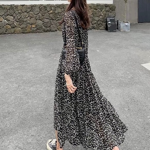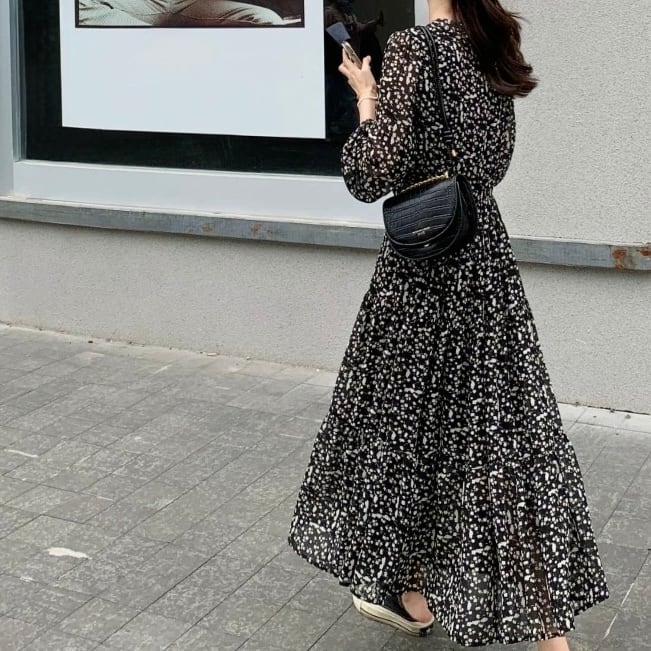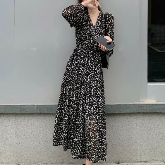 Vネックフラワーロングワンピース W00586