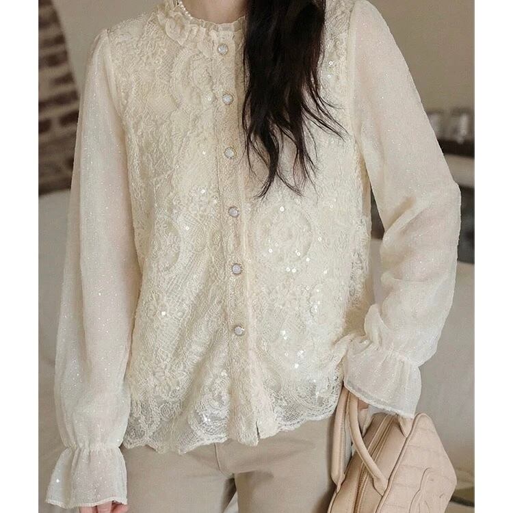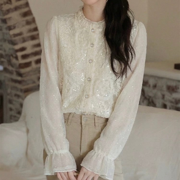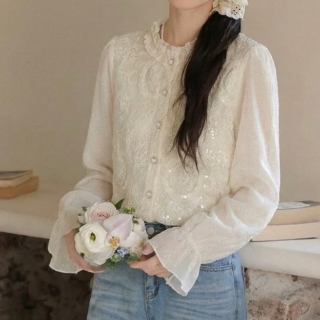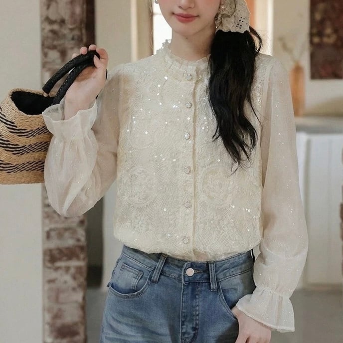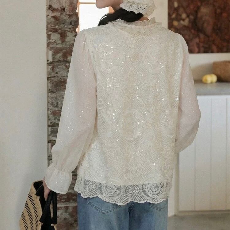 繊細なレースデザインが上品な雰囲気を演出するブラウス。